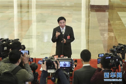 3月5日,第十三届全国人民代表大会第二次会议在北京人民大会堂开幕。这是工业和信息化部部长苗圩在“部长通道”接受采访。 新华社记者 殷刚 摄