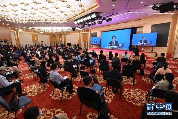 5月21日,十三届全国人大三次会议新闻发布会在北京人民大会堂新闻发布厅举行,由大会发言人张业遂就大会议程和人大工作相关问题回答中外记者提问。为有效防控疫情,共同维护公共卫生与健康,新闻发布会采用网络视频形式进行。 新华社记者 李贺 摄