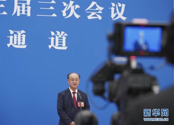 5月21日,在北京人民大会堂新闻发布厅举行全国政协十三届三次会议第一场“委员通道”采访活动。这是全国政协委员王辰通过网络视频方式接受媒体采访。 新华社记者 刘金海 摄