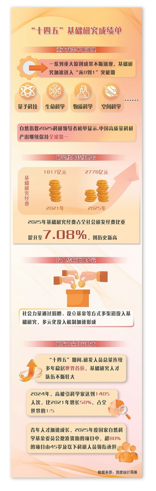 “十四五”以来,我国基础研究投入持续加大,基础研究体系不断完善,基础研究整体实力显著增强。展望“十五五”,要从基础研究顶层设计、投入机制、人才培养、评价改革等方面多管齐下,为原始创新松绑,为高质量发展蓄能。