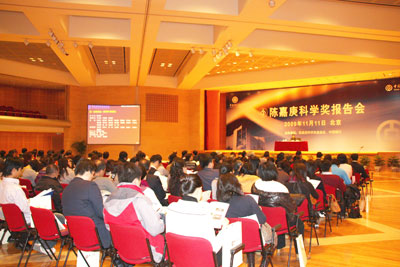 2009年11月11日,陈嘉庚科学奖基金会(以下简称“基金会”)和中国银行在北京中国银行总部大厦共同举行了陈嘉庚科学奖第二场报告会。首届陈嘉庚物质科学奖获得者、中国科学院院士赵忠贤研究员做了题为“科技进步、科技创新及转化---- 科学技术服务于科学发展”的科普报告。来自中国银行、中科院京区研究所、首都高校的听众及社会公众约300人参加了报告会。