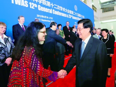 9月18日,国家主席胡锦涛在天津出席发展中国家科学院第十二次学术大会暨第二十三届院士大会开幕式并致词。这是胡锦涛在开幕式前亲切会见出席大会的部分来宾。新华社记者 兰红光摄