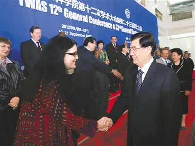 9月18日,国家主席胡锦涛在天津出席发展中国家科学院第十二次学术大会暨第二十三届院士大会开幕式并致词。这是胡锦涛在开幕式前亲切会见出席大会的部分来宾。新华社记者 兰红光摄