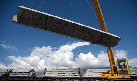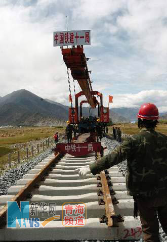 青藏铁路的施工人员在吊装最后一公里铺轨路枕