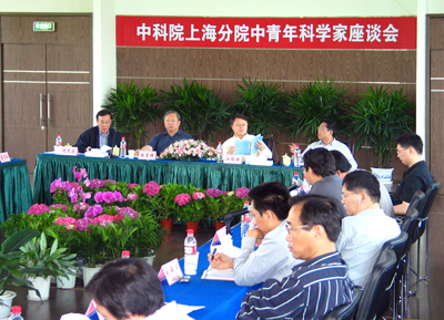 5月29日,全国人大常委会副委员长、中国科学院院长路甬祥,中国科学院副院长江绵恒与上海分院中青年科学家座谈。