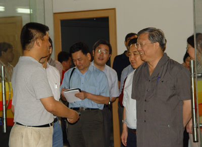 路甬祥院长在近代物理研究所视察兰州重离子加速器冷却储存环工程。 6月8日上午,路甬祥院长到近代物理研究所考察工作,视察了国家重大科学工程——兰州重离子加速器冷却储存环、重离子束治癌研究装置、激光实验室和高压平台,听取了詹文龙所长的工作汇报。