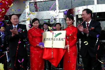 10月26日,坐落在北京中关村高科技园区的北京软件出口基地建成,北京市教工委书记朱善璐(前左一)和北京航空航天大学校长李未(右一)为该基地揭牌。