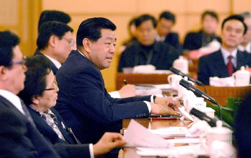 新华社北京2003年3月6日电 3月6日,中共中央政治局常委贾庆林来到他所在的十届全国人大一次会议北京代表团,与代表们共同审议政府工作报告。 新华社记者 张旭 摄