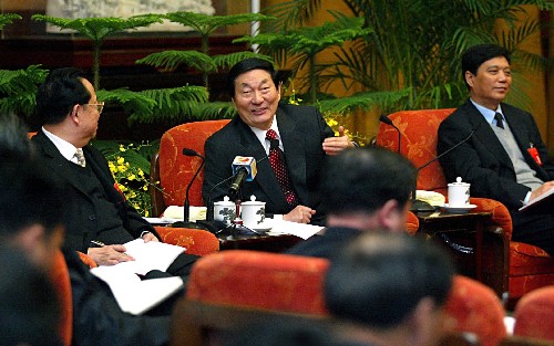 新华社北京2003年3月6日电 3月6日,国务院总理朱镕基参加十届全国人大一次会议湖南代表团全体会议,听取代表审议政府工作报告的意见和建议。新华社记者 刘建生 摄