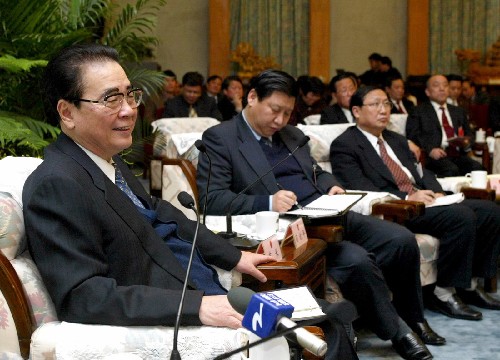 新华社北京2003年3月6日电 3月6日,全国人大常委会委员长李鹏参加十届全国人大一次会议浙江代表团的审议。新华社记者 鞠鹏 摄