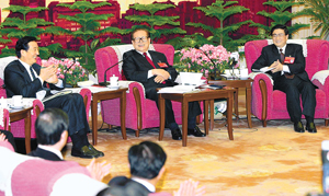 新华社北京2003年3月6日电 3月6日,国家主席江泽民参加了他所在的上海代表团的全体会议,与代表们一起审议政府工作报告。中共中央政治局常委黄菊也参加审议。新华社记者 饶爱民 摄