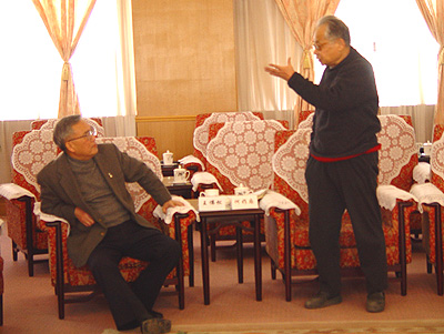 何祚庥院士(右)在与王佛松院士交谈。(《科学时报》段煦摄)