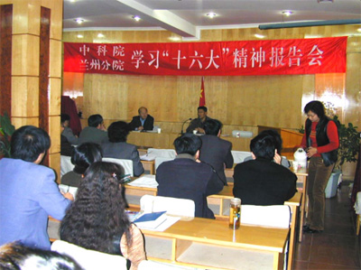 会后,何易书记、詹文龙所长接受了记者的采访。何易书记说,学习十六大精神,除了要深刻领会精神实质外,还要发扬我们党理论联系实际的好学风。当前,我院知识创新工程已进入第二阶段,兰州分院各项工作正在有条不絮的开展,我们将结合学习江泽民同志的报告,认真实施“三大创新战略”,即科技创新跨越式发展战略,科技创新人才发展战略和科技创新可持续发展战略。分院各所都要根据十六大精神,组织精干、高效的科研队伍,争取承担更多的国家重大研究项目,为区域经济的发展做贡献。