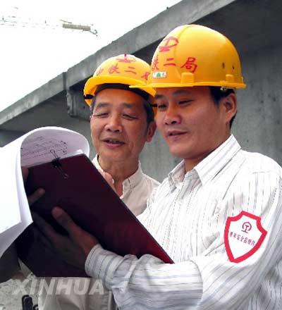 6月25日,负责国家重点工程--渝怀铁路施工的中铁二局桥梁厂的高级工程师、党员张保康(左)在施工现场检查工程质量。