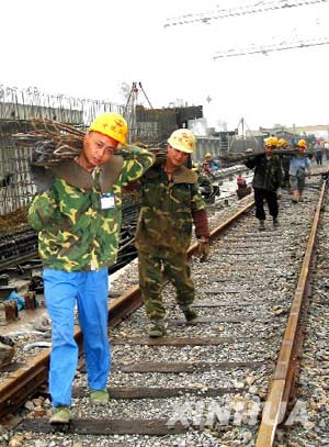 6月25日,负责国家重点工程--渝怀铁路施工的中铁二局桥梁厂优秀共产党员、钢筋班长张伟(前)和工友们一起抬着钢筋进入工地。在学习贯彻“三个代表”重要思想的过程中,该厂党员干部身先士卒,积极起模范带头作用,带动职工投入工程建设,确保质量。