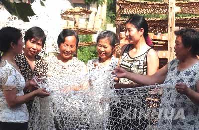 6日26日,陕西省石泉县池河镇明星村的几位妇女正在互相学习编织蚕网技术。