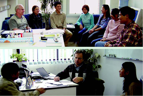 上图:自20世纪80年代末以来,W.亨宁 (Wolfgang Hennig) 教授一直在客座实验室开设课程,培养了大量中国和德国学生。图为W. 亨宁 教授与他的小组成员在上海的实验室里。 下图:W. 施瓦茨 (Wolfgang Schwarz) 教授利用客座实验室的设备进行教学已有10年的历史。
