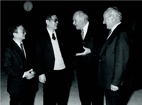 中国科学院院长周光召教授、马普学会主席H·扎赫尔教授、马普学会宇宙物理研究所所长J·特吕姆佩尔教授和中国科学院北京天文台台长李启斌教授在交谈中。 德国统一后不久,周光召教授对德国东部德累斯顿、莱比锡、耶拿、柏林等城市进行了访问并于90年代又接连几次进行访问。他对原德意志民主共和国的全面科学改革及其如何适应西方的科研体制非常感兴趣。