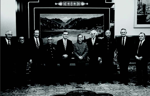 1983年10月, 马普学会主席R.吕斯特教授率团访华,代表团成员包括: 马普学会副主席H·科英教授、B·赫斯教授、 G·维尔克教授,以及马普学会理事 H·洛依辛克教授和洪堡基金会秘书长 H.普菲弗博士。访问期间,双方签署协议在上海细胞生物学研究所建立马普客座实验室。图为国务院副总理方毅接待德方代表团,中国科学院院长卢嘉锡教授和德国大使 G·朔德尔博士在座。