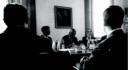 1974年6月12日,中国科学家首次访德代表团访问位于慕尼黑的马普学会总部。图为中国科学院副院长周培源教授(中)与马普学会主席 R·吕斯特交谈。