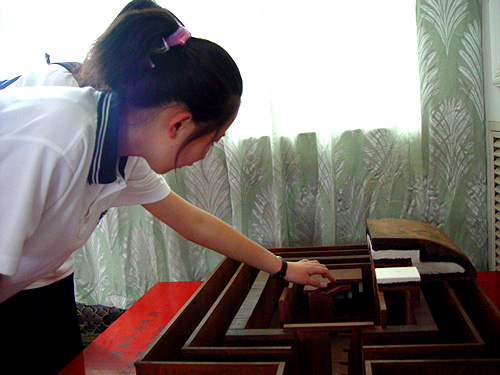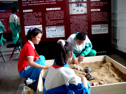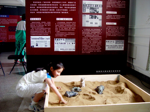 来到北京大葆台西汉墓博物馆的展区时,看到同学们在“坑”里玩沙子,上前与之攀谈后,令记者没想到的回答居然是——“我们在发掘汉墓!”忽然,一个西汉风格的陶俑被“发掘”出来,同学们一阵欢呼。接着,提梁卣、铜犀尊也“出土”了。原来,这是博物馆的工作人员为了激发同学们的探索能力和对历史知识的兴趣精心准备的“考古探方”。