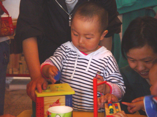 本次科技周活动会场上有很多增强动手能力的小实验和小制作,不仅引起了少年朋友们的兴趣,就连这位刚刚蹒跚学步的小朋友也要来试一试身手。