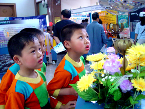 “这花用灯一照就开”,在记忆金属材料展台前,小观众这样告诉记者。