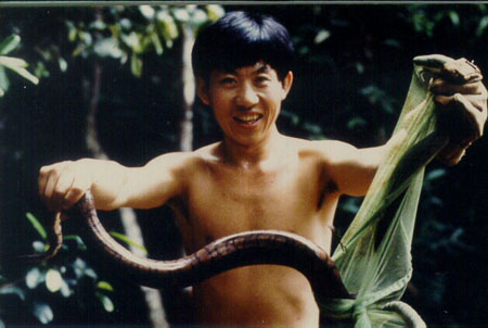 逐渐地,见的蛇多了,便学会了如何鉴别有毒蛇与无毒蛇,对蛇不再恐惧,也不再使用皮绑腿。其实,有毒蛇与无毒蛇之间是有很大区别的,前者主要分两大类:蝰科和眼镜蛇科。蝰科蛇头部呈膨大的三角形,尾部骤然变细;眼镜蛇身体一般有环纹。不过,更精确的外形分类标准还在于它们体表的鳞片结构和形状,蛇一生中可以多次蜕皮和变换体色,但其鳞片结构是一成不变的。再后来,竞不知不觉地喜欢上蛇,也开始“玩”蛇了。生态站有规定,为了鉴定和研究的需要,可以捕捉动物,但必须在尽短的时间内将动物送回“原籍”。当然,也有蛇主动前来登门拜访。某天早晨,有人在鞋里发现了黄色小蟒,它刚刚吞食一只绿色大鸟,肚皮撑的成了半透明,跑到鞋里消化来了。某个暴雨倾盆的下午,一只巨大的青蛙在帐篷旁边发疯般地向前蹿,我探头一看,好家伙!原来是3米多长的棕黑猎蛇尾追其后。不过,更滑稽的还得数下面这个插曲: