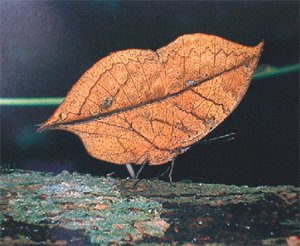 众所周知,拟态是指某些动物在形状、色泽、斑纹等外表特性上与其它生物或非生物相似的现象,昆虫拟态的现象存在于自然界的许多生态环境中。但在南美热带雨林,昆虫的拟态可以说进化到了无处不在、出神入化的程度。记得有一次我正在森林里拍照一株小巧玲珑的兰花,忽然隐约感觉树枝上的一块苔藓在蠕动,定神一看,原来是个奇形怪状的昆虫。它深绿的体色和粗糙不平的体表使得它与周围的苔藓俨然溶为一体,倘若静止不动,再锐利的眼睛也恐怕难以发现它。我好奇地将这个昆虫捉起放在枯树干上,它尖尖的头部和臃肿的身躯一下子显得十分扎眼。还有一次,一个逗趣的法国同事指着光滑的树干让我在水平视野上下一米的范围内找昆虫,我围着树干转了三圈,竞没发现任何蛛丝马迹。灵机一动,我沿着树干的侧面寻找突出点,这下子成功了,原来是一条一寸长的蝗虫紧贴在树干上,其颜色和斑纹与树干的一模一样。斑眼蝴蝶是拟态现象中更为典型的例子,这类蝴蝶翅膀上有圆圆的黑斑点,两只翅膀张开时逼真地构成一副猫头鹰的脸谱。这样,鸟见到它们不仅不敢捕食,反而被吓得逃之夭夭。 应该强调的是,昆虫并非唯一的具有拟态本领的动物类群。行走在铺满落叶的林间,脚下会突然蹿起一两只褐色蜥蜴,眼神追随到小动物停将处,却又很难再捕捉到踪迹。更有意思的是一种角蛙,体色与枯叶极其相似,脑后长着一对凸出的“角”,正仿佛翘起的枯叶片。鸟类中也不乏拟态高手,记得第一次攀上生态站附近的裸山,我被一块突然飞起的“石头”吓了一跳,等“石头”落地后定睛一看,哪里是什么石头,而是与岩石表面的颜色和斑点一模一样的夜莺。还有一次在丛林中遇到一条通体具有鲜艳环纹的蛇,我却想不起鉴别金环蛇与假金环蛇的法则。要知道金环蛇的神经毒素可以让人在数小时内停止呼吸,而假金环蛇不会对人造成任何伤害。于是,我只好乖乖地拍了几张照片而不去动它。等返回生态站大本营对照图谱一看,追悔莫及,原来是“冒牌货”。不过,以假当真终究比以真当假好,我的一个法国同事就曾经范了这样一个大错误,幸好事情发生在另一个交通方便的生态站,一小时候后他便被送进医院,否则恐怕真的无缘再与他共事了。