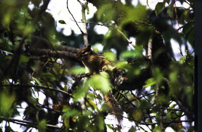 小纹又频繁出现在我们营地旁了,送走了小花鼠,它可以松口气了。现在的小纹爱吃昆虫,有时也偷吃鸟蛋和雏鸟,像个小强盗。它的捕食技巧并非高明,但是却知道对昆虫和小鸟的头部下手,并且先吃掉头部。莲花山的夏季是多雨的季节,小动物是很怕潮湿的,也许小纹对自己潮湿的地下洞穴不太满意,所以它在洞穴旁一颗树上的人工鸟巢中建造了第二个家。这个家像个别墅,既能看风景,又能避风雨。