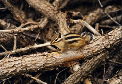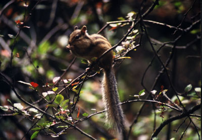 秋季是莲花山最迷人的季节,黄、红、青、紫、粉五种色彩镶嵌在绿色的地毯上,覆盖了整个莲花山,莲花山地处甘肃省南部,属于省级自然保护区。此时,在云冷杉林中的空地上,一种松鼠科小动物正在忙碌地找寻食物,它好像无意欣赏莲花山美丽的景色,这是一只花鼠(Eutamias sibiricus),从它身上特有的5条纵纹上很容易识别出来。几个星期以来,我们营地旁的这只花鼠一直在抓紧时间搜集食物,以便度过漫长少食的冬季。