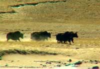 野牦牛也是青藏高原有的特有物种,在阿尔金山自然保护区约有上万头,它彪悍健壮、体型硕大,是高原上的巨无霸,成年公牦牛身长可达3.3米,肩高1.7米,体得达一吨左右,是家养牦牛的一倍,发起牛脾气可将一辆解放大卡车顶翻。野牦牛是典型的高寒动物,适合在海拔3000——6000米的高山谷地中生活,而在低海拔区却很容易死亡,野牦牛喜欢群居,在保护区东部库木库里沙漠的沙子泉经常可以看到它们三五成群的身影,多的时候可达几百头。