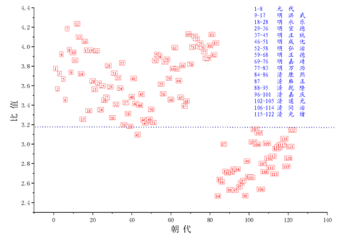 目前我所古陶瓷实验室已建立约含有2000个标本的数据库。其中景德镇瓷器胎、釉的主、次、微量元素数据比较多,可以作为鉴定景德镇瓷器的初步依据。现仍在收集相关标本进行测试。争取所得的规律更具有代表性。图1和图2为近期利用已有的主、次、微量元素数据,经过初步运算处理所得的结果。