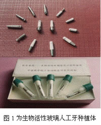 近年来,由生物材料制成的人工牙种植体在临床上已经获得成功。图1为目前国内外最先进的二段式人工牙种植体,它是由喷涂生物活性玻璃涂层的下桩及安装牙冠的上桩二部分组成。这种生物材料能在人体骨组织中与生理液体相互作用,生成叫做“羟基磷灰石”的一种成分。这种成分与骨骼中的羟基磷灰石非常接近(骨骼中羟基磷灰石重量百分比占65wt%)。因为骨骼是一种活矿物,它在不断地生长、溶解、重构,所以喷涂生物活性玻璃涂层的人工牙种植体能与骨组织紧密结合,形成化学键合,即骨化。种植体骨化后,周围骨组织围绕种植体生长,包埋种植体并与骨组织紧密连接,使种植体牢固。