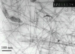 图一:二氧化钛纳米管。多种层状材料可形成管状材料,最为人们所熟悉的是碳纳米管。图一为二氧化钛纳米管的透射电镜照片,这种管是开口、中空管,比表面积能达到400m2/g,可能在吸附剂、光催化剂等方面有应用前景。