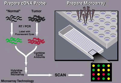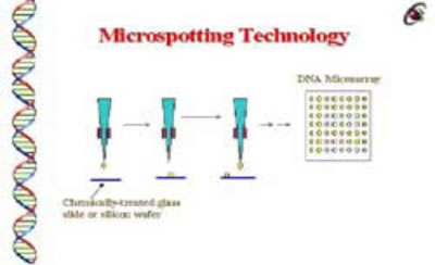 第二种方法是喷墨法,利用一种喷墨装置,就像喷墨打印机一样,将生物样品喷在玻璃表面上。这种方法可以在指甲盖(1cm2大小)上喷一万个点。第三种方法是在位合成法,此方法是在玻璃上构建一些微结构(比如说微孔,微通道),然后在这些结构上合成生物样品,再用一种膜盖上,最后,生物样品也有规则地放在玻璃上了。这种方法的优点是密度高,可以在指甲盖上放四十万个点。