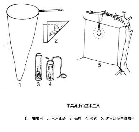 初学者,要想识别更多的昆虫种类,首先要学会采集,通过采集可以加深对昆虫的认识。采集也是培养和巩固初学者对昆虫产生浓厚兴趣的有效途径。昆虫分布广泛,山前屋后,室内室外,只要稍加留意,便可采到。但要注意,昆虫的活动是受时间、环境及温湿度制约的。前面已经提到昆虫每一类群都有它各自喜欢的环境,而各类群昆虫不是同时出现的,从物理学角度讲,昆虫的发生期有一年一代的,也有一年多代的。要掌握昆虫出现和停止活动的大概时间,除热带地区,通常每年春季昆虫开始陆续出现。从三月至秋季十月都适于采集。十月之后天气转冷,昆虫活动渐少。所以采集昆虫的时机集中在气温较高的时期。当然,冬季也可采到越冬的昆虫。有了较理想的采集时机还要注意理想的采集环境。昆虫种类繁多,各有各的生活习性和喜欢的活动场所。如蝴蝶喜欢在花丛溪流边飞舞,蜻蜓则喜欢在河边草丛上停息或在黄昏时捕捉猎物。甲虫有些喜欢在植物叶面上取食,有些则躲藏在树皮或碎石杂物下。有些大型甲虫如屎克螂类更喜欢穿梭于动物粪便中。水生昆虫如龙虱、水龟虫等生活在水塘或沟渠里。白天可采集大量的日出性昆虫,而夜出性昆虫只有在晚上采集最理想,它们多数喜欢聚集于灯下或有亮的场所。