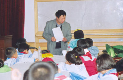 海洋所的李鹏程研究员在回答小学生们的提问。
