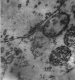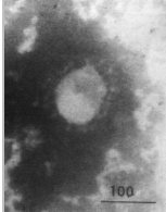 人工感染传染性胃肠炎病毒的仔猪回肠上皮细胞照片,病毒内部有一个“烧面圈”样的核壳体,外面是病毒囊膜
