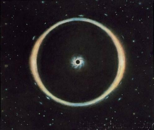 爱因斯坦圆环。图中是位于地球与另一个星系之间的黑洞。遥远星系发出的光线由于黑洞极强的引力场而发生弯曲,成为一个环状。这种现象被称为重力透镜。光线会在重力场作用下发生弯曲的理论是爱因斯坦在他的广义相对论中提出的。近几年来,随着天文观测技术的不断进步,已经发现了更多的重力透镜现象。