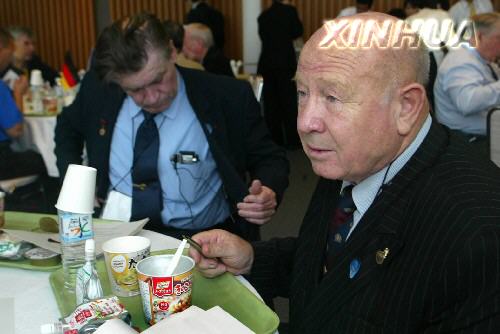 10月14日,人类首位太空行走者、前苏联宇航员列昂诺夫(右)在日本东京品尝太空食品并为其打分。当天,出席第18届世界宇航员大会的各国宇航员对日本食品科学工学会开发的太空食品进行了评定。太空食品的营养和口味对在空间站长期滞留的宇航员的身心健康具有很大影响。