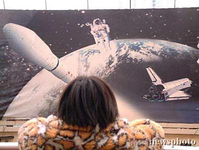 一位儿童被申城街头的神舟飞船广告所深深吸引