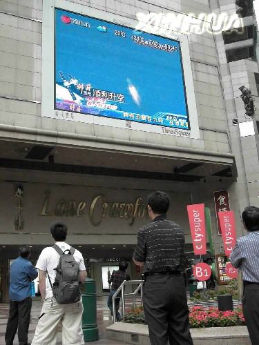 10月15日上午,一些香港市民聚集在香港时代广场大屏幕前观看“神舟”五号发射成功的录相转播。连日来,香港市民热切关注“神舟”五号发射消息,得知“神舟”五号发射成功后,香港市民感到高兴和振奋。