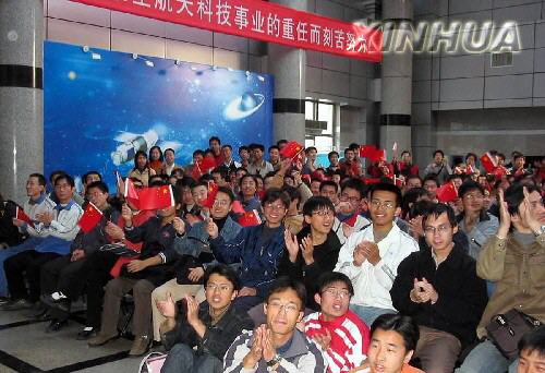 10月15日,北京航空航天大学各院系100多名研究生自发聚集在电视大屏幕前观看“神舟”五号发射的新闻。当发射成功的消息传来,学子们欢声雷动。