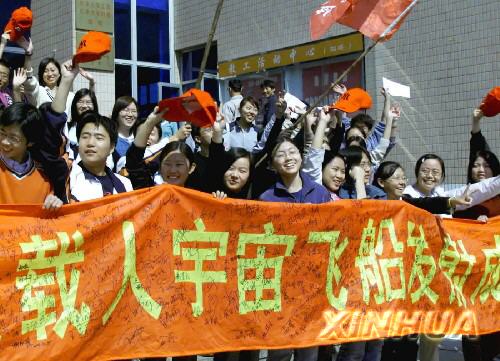 10月15日,上海大学生手持万人签名条幅,表达对成功发射的“神舟”五号的美好祝福。当日9时,“神舟”五号载人飞船在酒泉卫星发射中心发射升空。