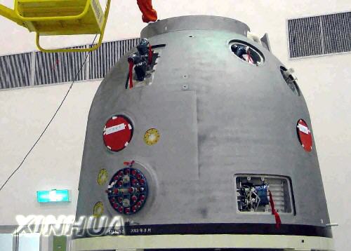 10月15日9时,“神舟”五号载人飞船在酒泉卫星发射中心由“长征”二号F型运载火箭发射升空。中国航空航天工作者用自己的智慧和汗水迎来了这激动人心的一刻。 这是正在安装的“神舟”五号飞船返回舱。