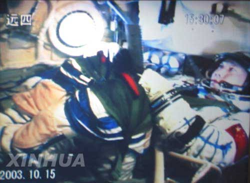 15时28分,神舟五号飞船进入第五圈飞行。航天员杨利伟的画面再次出现在北京航天指控中心指挥大厅左前方大屏幕上。