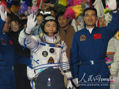杨利伟激动地和翟志刚、聂海胜相互握手拥抱,然后不停地向欢送的人群挥手致意。