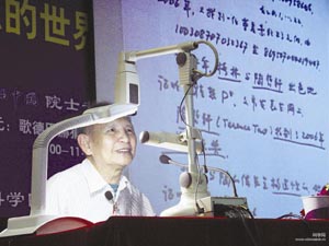 王元在作科普报告 素数、合数、等差数列……深奥的数学理论,在王元院士手书幻灯片的放映和讲述下,深入浅出、引人入胜。