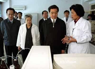 5月1日,中共中央总书记、国家主席胡锦涛在天津检查防治非典型肺炎工作的落实情况,亲切慰问为防治疫病辛勤工作的广大干部群众、医务工作者和科研人员。 这是胡锦涛在天津市卫生防病中心深入了解全市防治工作的进展情况。 新华社记者 兰红光摄